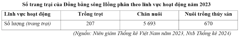 Căn cứ vào bảng số liệu trên, hãy cho biết tỉ trọng số lượng trang trại nuôi trồng thủy sản cao hơn tỉ trọng số lượng trang trại trồng trọt của Đồng bằng sông Hồng năm 2023 là bao nhiêu % (làm tròn kết quả đến chữ số thập phân thứ hai).