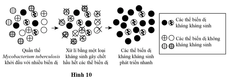 Câu 6. Hình 10 mô tả quá trình hình thành các chủng vi khuẩn kháng kháng sinh theo học thuyết Darwin.