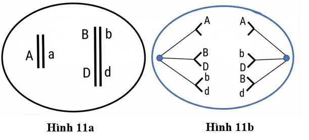 Câu 6. Hình 11a mô tả kiểu gene của một tế bào sinh tinh X, Hình 11b mô tả một giai đoạn trong quá trình giảm phân của tế bào X. Kết thúc qu...