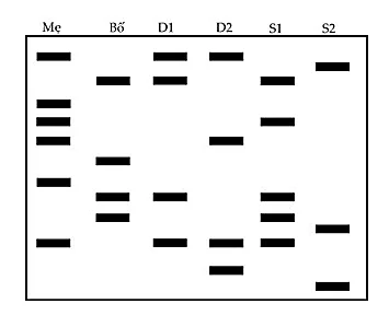 Câu 6. Một người đàn ông trong một gia đình nghi ngờ về huyết thống những đứa con nên đã tiến hành xét nghiệm DNA. Kết quả thu được như dưới đây (các băng cùng một hàng ngang thể hiện kích thước bằng nhau).
