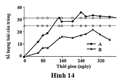 Câu 6. Một quần đảo gồm nhiều đảo lớn nhỏ nằm ngoài khơi ven biển Đông Nam nước Mĩ. Hai đảo A và B có diện tích tương đương, tách biệt hoàn toàn với nhau và với đất liền, ban đầu có mức độ đa dạng loài côn trùng ổn định. Người ta tiến hành phun thuốc trừ sâu với liều lượng lớn lên cả hai đảo nhằm loại bỏ phần lớn côn trùng. Sau thí nghiệm, không có yếu tố ngẫu nhiên (như đột biến, di nhập ngẫu nhiên hay biến động môi trường bất thường) tác động đến quần thể; sự thay đổi số lượng loài chỉ phụ thuộc vào khả năng phục hồi sinh thái của từng đảo. Trong thời gian tiếp theo, người ta theo dõi sự biến động số lượng loài côn trùng theo thời gian trên hai đảo A và B. Kết quả được thể hiện trong Hình 14, trong đó đường nét đứt biểu thị số lượng loài trước khi tiến hành thí nghiệm.