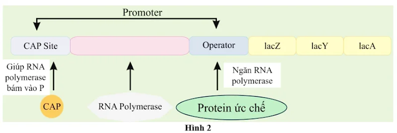 Dùng thông tin sau để trả lời câu 7 và câu 8: Hình 2 mô tả cấu trúc và cơ chế điều hòa hoạt động của Operon Lac ở vi khuẩn E. coli. Sự phiên mã các gene cấu trúc (lacZ, lacY, lacA) được kiểm soát đồng thời bởi hai tín hiệu: Lactose (Điều hòa âm tính): Khi có Lactose, protein ức chế không bám vào vùng Operator, cho phép RNA polymerase bắt đầu phiên mã. Glucose (Điều hòa dương tính): Khi Glucose thấp, protein CAP bám vào CAP Site, hỗ trợ RNA polymerase liên kết chặt với vùng Promoter để đạt tốc độ phiên mã tối đa.