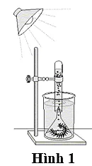 Câu 7: Hình 1 mô tả một thí nghiệm sử dụng cây rong đuôi chó đặt trong nước có pha baking soda và chiếu sáng bằng đèn.