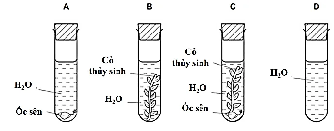 Câu 8. Bốn ống nghiệm được thiết lập như hình dưới đây và để dưới ánh sáng mặt trời đầy đủ. Sau 1 giờ, ống nghiệm nào chứa nhiều carbon diox...