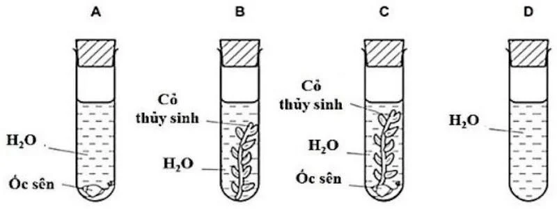 Câu 8. Bốn ống nghiệm được thiết lập như trong sơ đồ bên dưới và để dưới ánh sáng mặt trời đầy đủ. Sau 1 giờ, ống nghiệm nào chứa nhiều carb...