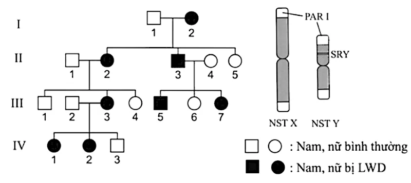 Câu 8: Ở người, chứng loạn sản sụn Leri Weill (LWD) do một allele đột biến của gene SHOX gây nên. Gene này gồm 2 allele, trội – lặn hoàn toàn, nằm trong vùng PAR1 của NST X và Y. Người mắc LWD thường có tầm vóc thấp do biến dạng xương chân; xương tay cũng có thể bị biến dạng. Sơ đồ phả hệ ở hình bên mô tả sự di truyền của LWD trong một gia đình. Qua phân tích, người ta thấy rằng trong quá trình giảm phân hình thành giao tử ở người II.3 đã xảy ra tiếp hợp và trao đổi đoạn NST giữa X và Y gây ra hoán vị gene. Hiện tượng này không xảy ra đối với những người khác trong phả hệ và không xuất hiện các đột biến khác. Khi nói về sự di truyền của LWD, phát biểu nào sau đây sai?