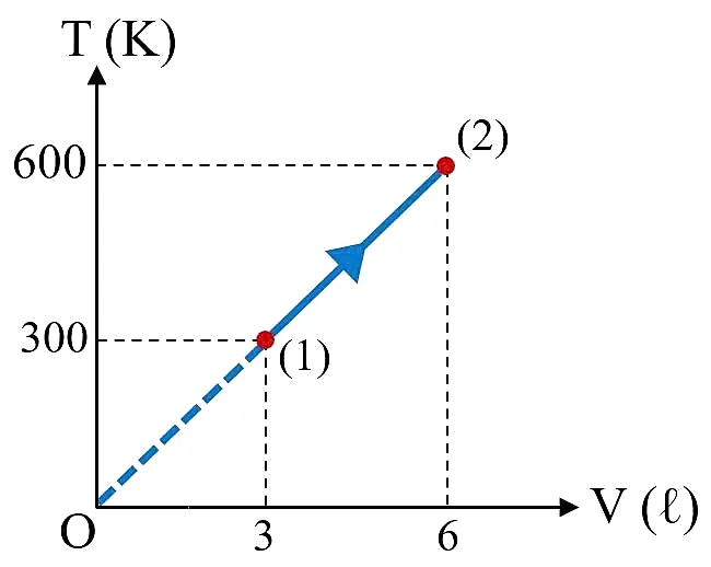 Sử dụng các thông tin sau cho câu 8 và câu 9: Một mol khí lí tưởng xác định thực hiện quá trình biến đổi trạng thái từ (1) đến (2) được biểu diễn trong hệ tọa độ (V, T) như hình vẽ.
