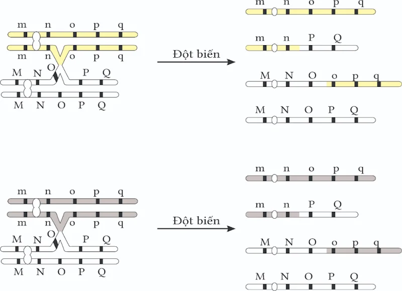 Câu 9. Một loài thực vật lưỡng bội sinh sản hữu tính, xét cặp NST số 1 chứa các cặp gene M, m; N, n; O, o; P, p; Q, q. Giả sử quá trình giảm phân ở một số tế bào của cây A xảy ra hiện tượng đột biến được mô tả như Hình 5.